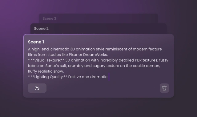 ストーリーボードモードを使用して、複数のシーンからなるサンタ動画を計画・構成します。各シーンを記述することで、複雑なシークエンスを容易に指示し、詳細でパーソナライズされた結果を得るためのシームレスでリアルなストーリーテリングを作成できます。